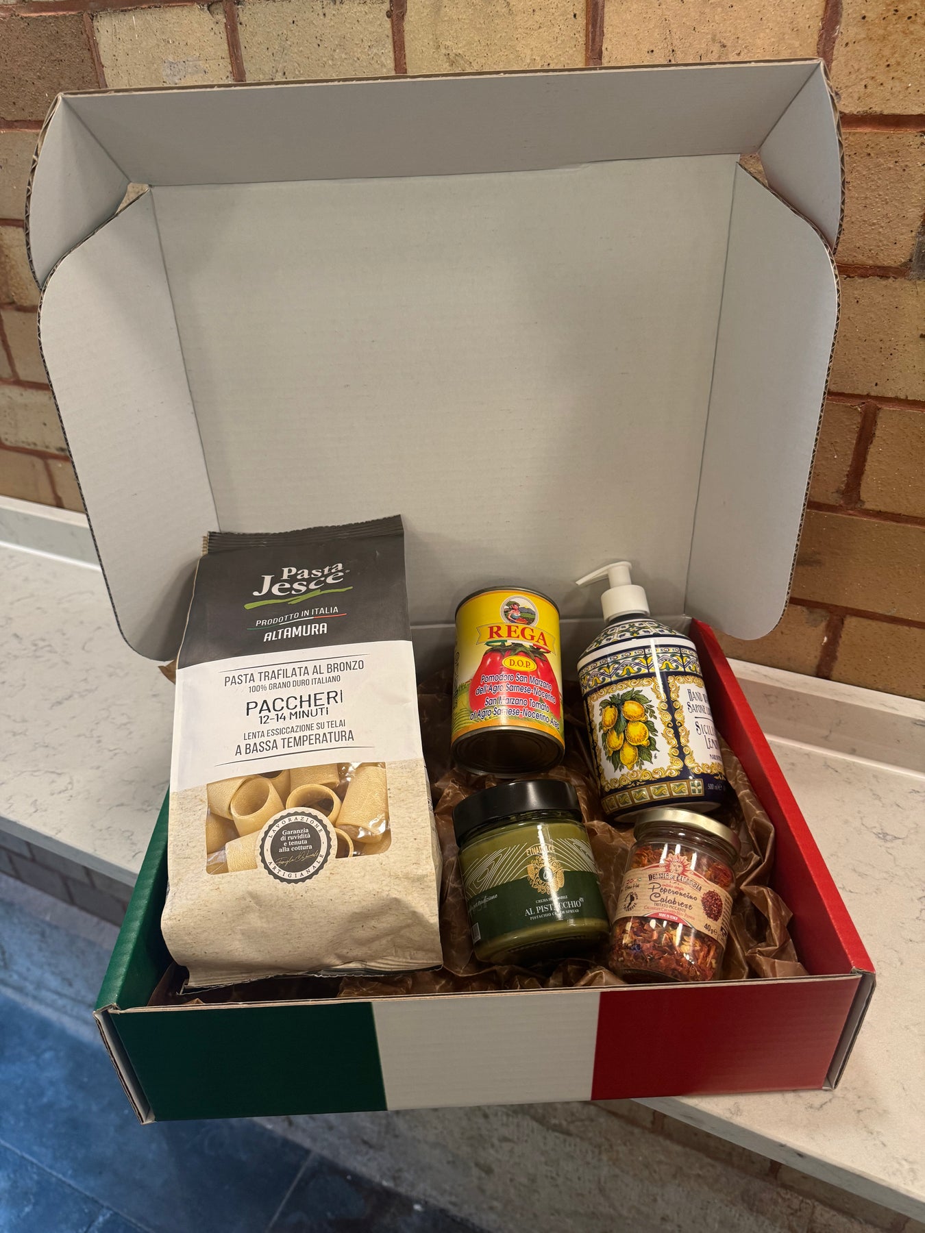 Perfekt gåva att ge bort med kvalitetspasta från Puglia, Tomaternas Ferrari - San Marzano, magisk pistagekräm, torkad chili från Kalabrien och väldoftande tvål med citrustoner från Sicilien.